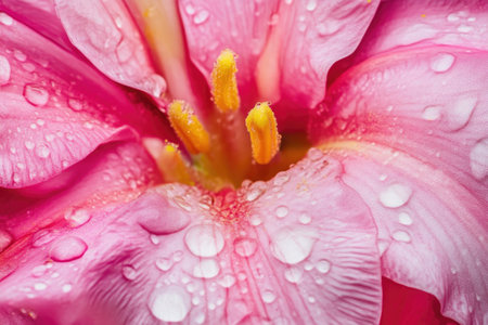 Close-up of vibrant petals under a gentle rain, each drop a crystal lens magnifying the flower's natural elegance.