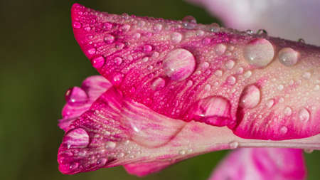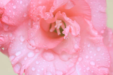 Pink gladiolus flower in dew close-up. Natural floral background, wedding or birthday celebration