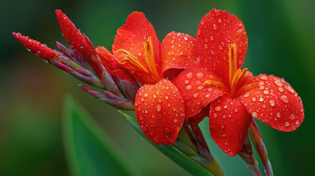Close-up image of two vibrant red canna lilies with water droplets on their petals. The petals are detailed, showing delicate textures. The flowers are in sharp focus against a blurred background of green foliage. The image emphasizes the beauty and freshness of the flowers.