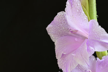Beautiful purple gladiolus flower with water drops on black background