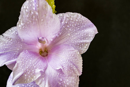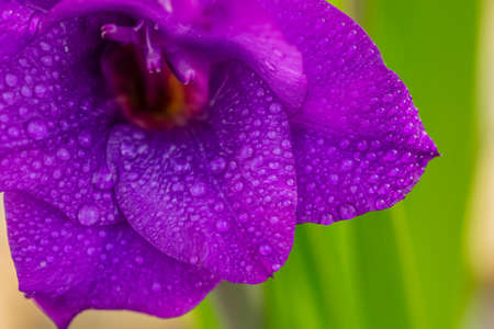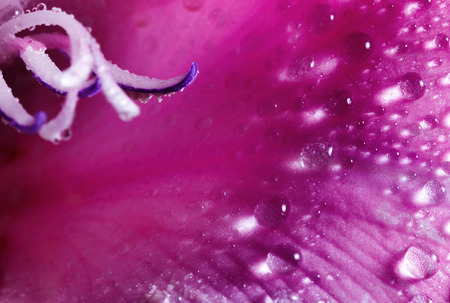 Delicate flower of gladiolus in water drops. Purple floral background