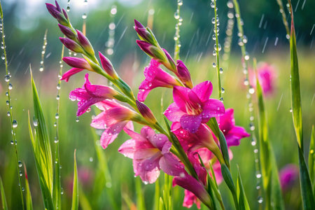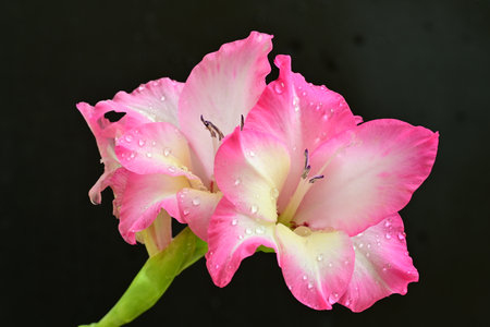 Beautiful pink gladiolus flowers with rain drops on petals.