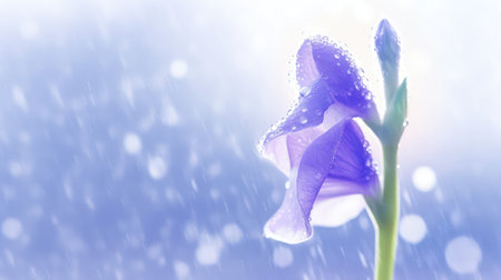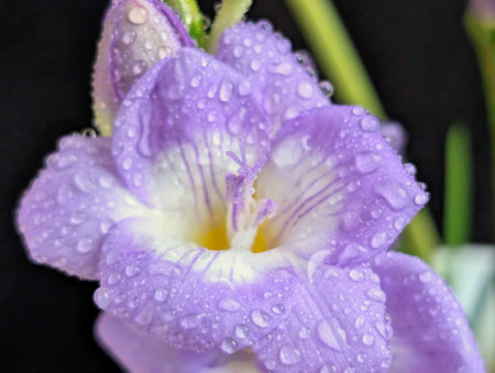 This close-up image showcases a stunning purple flower adorned with glistening water droplets. It captures the beauty and freshness of nature, emphasizing delicate petals and vibrant colors. Perfect for nature lovers and floral enthusiasts.