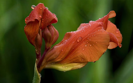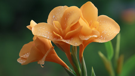 Vibrant Orange Canna Lily Blossoms Adorned with Sparkling Dew Drops