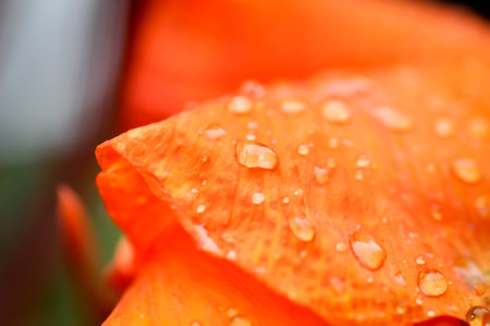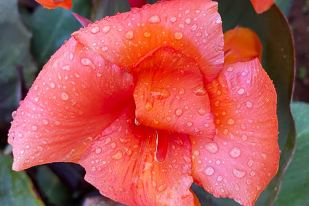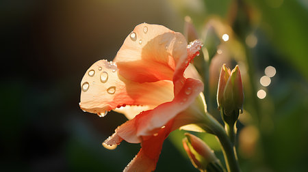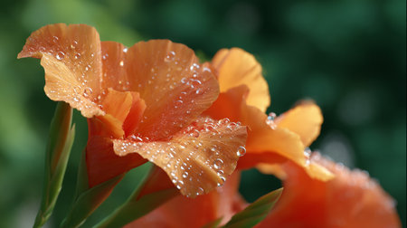 Vibrant orange canna lily glistening with dewdrops in soft sunlight