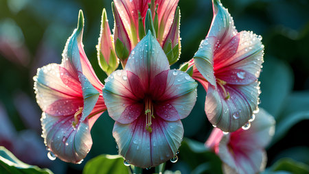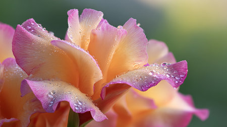 Radiant Gladiolus Blossoms with Dewdrops Sparkle on a Soft Green Background