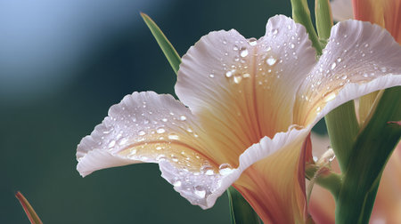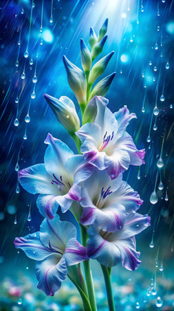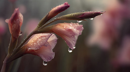 Soft rain falling gently on Gladiolus, with water droplets forming and slowly dripping. The background is softly blurred with a natural, moody atmosphere.