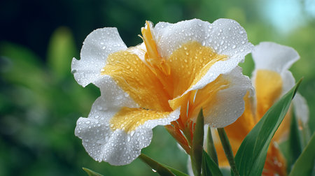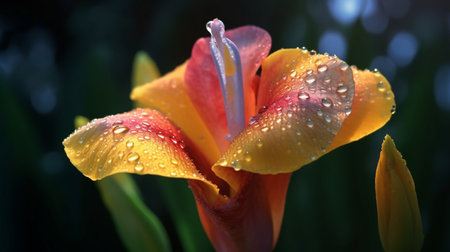 Dew kissed canna lily in morning light, a vibrant nature portrait