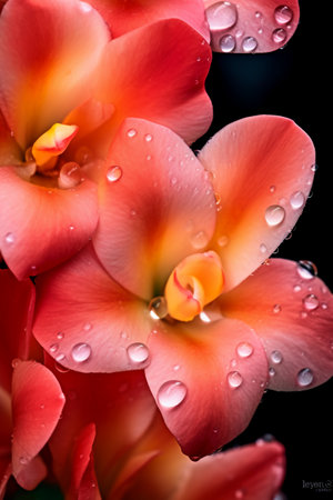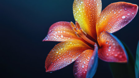 A dramatic close-up of a tropical flower with vivid colors, showcasing water droplets that enhance its beauty, set against a contrasting dark background