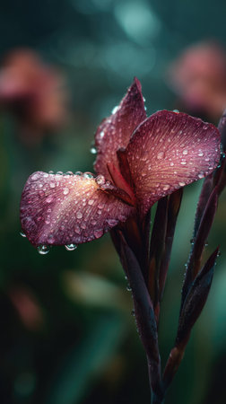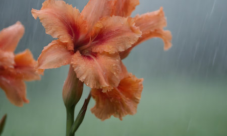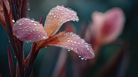 Soft rain falling gently on Canna lily, with water droplets forming and slowly dripping. The background is softly blurred with a natural, moody atmosphere.