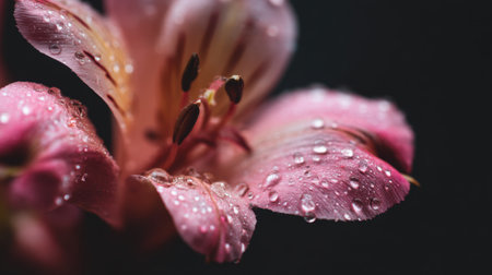 Raindrops on the petals of a pink lily on a black background