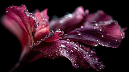 A stunning close-up of purple petals adorned with glistening dew drops highlights nature's intricate details. The dark background accentuates the beauty and elegance of this flower, making it a perfect choice for artistic inspiration.
