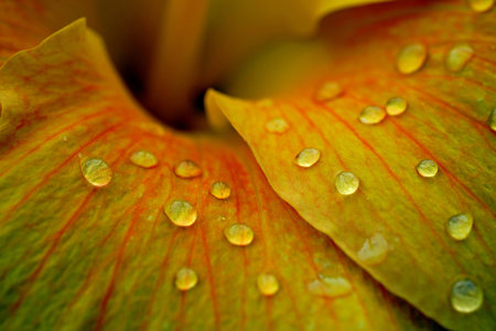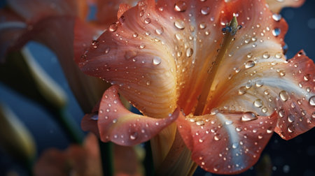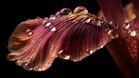 This stunning close-up captures a flower petal adorned with glimmering water droplets, revealing intricate textures and colors.