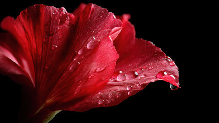 This stunning close-up features a vibrant red flower petal glistening with water droplets against a dark background, ideal for nature-themed projects.