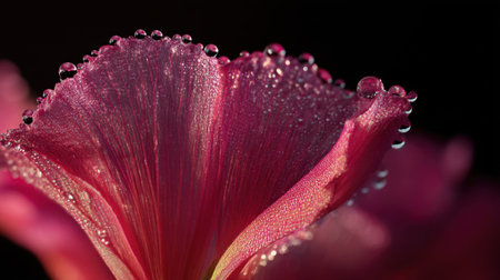 This close-up image captures the intricate details of a pink flower petal adorned with glistening dew drops. The dark background accentuates its natural beauty and texture, creating a serene and vibrant sense of calm.