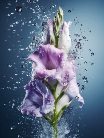 gladiolus flower in water with bubbles on a blue background