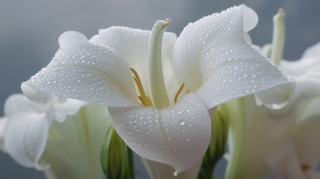 This close-up image captures a beautiful white flower with glistening water droplets, showcasing its delicate petals and serene beauty in nature.