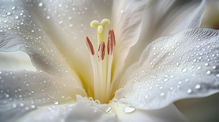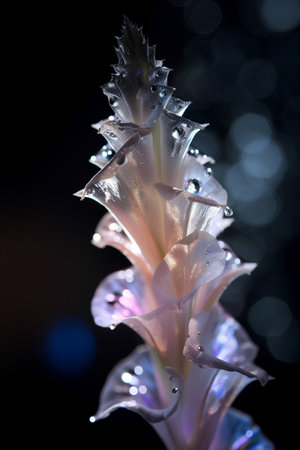 Close-up of a delicate flower with glistening water droplets on its petals, capturing the intricate details and fresh, dewy appearance.