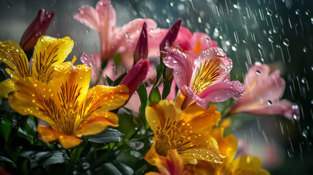 A picturesque view of a bunch of flowers with glistening water droplets, creating a stunning contrast against the vivid colors and soft natural light