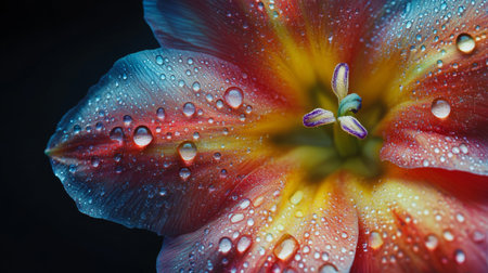 A stunning close-up of a vibrant flower displaying intricate colors and moisture beads, highlighting nature's beauty against a dark background.