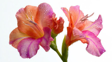 This stunning image showcases vibrant orange and pink gladiolus flowers adorned with delicate water droplets, perfect for nature lovers and floral enthusiasts.