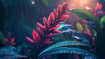Tropical rainforest flower with neon colors, glistening with water droplets under a soft mist generative ai