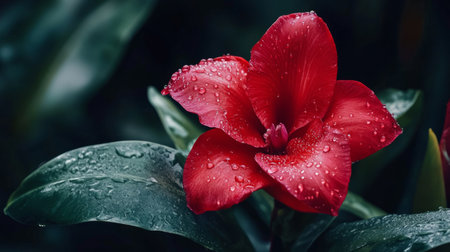 Delicate red ginger flower with water drops on its glossy petals, surrounded by lush green leaves, tropical aesthetic generative ai