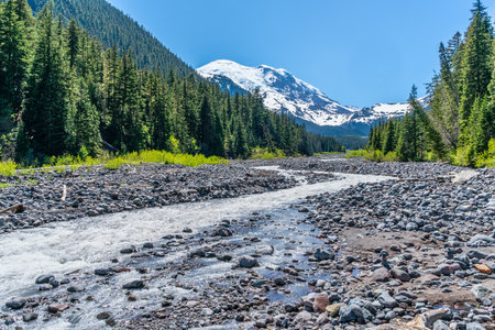 Majestic Mount Rainier rising above forests and river in the national park under a sunny sky