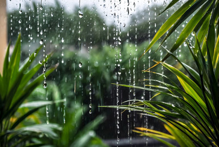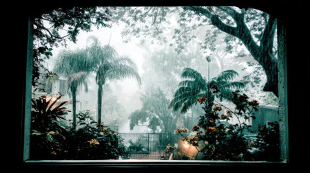 A dramatic scene looking through a window at a heavy downpour in a lush tropical garden. Palm trees and foliage are blurred by the intense rain creating a moody atmosphere.
