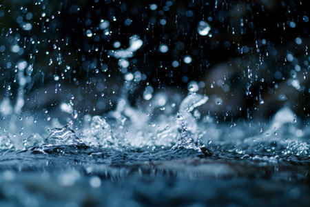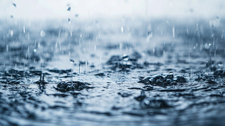 Close-up of raindrops hitting a surface, creating water droplets. The image showcases a shallow depth of field, with a focus on the textured surface and the falling water. Dominant colors are blues and grays, suggesting a cool environment. Suitable for editorial and commercial use, this image evokes a sense of calm and natural phenomena.
