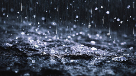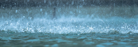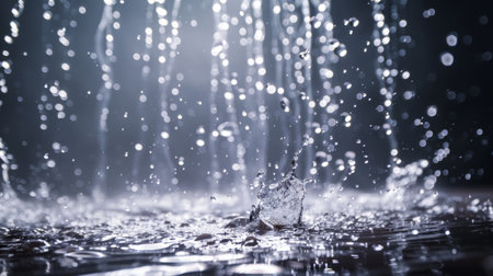 This image presents a close-up view of raindrops falling onto a surface. The composition highlights the water droplets, creating a sense of movement and texture. The cool color palette and blurred background suggest a wet environment. Suitable for editorial purposes.