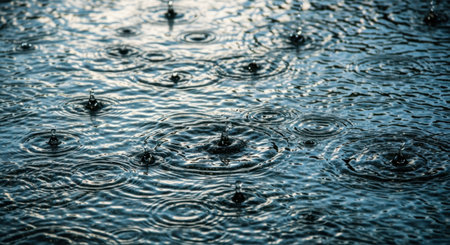 Raindrops fall onto a dark, rippling water surface, creating beautiful, expanding concentric circles.
