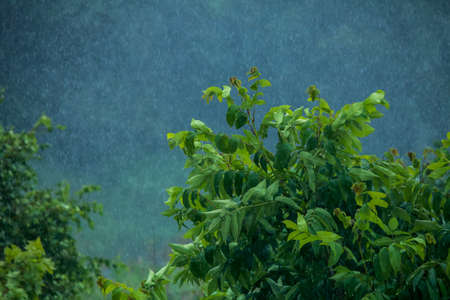Summer thunderstorm rain refreshing nature meadow. Background with rain drops in meadow. Rain is condensed moisture of the atmosphere falling visibly in separate drops.