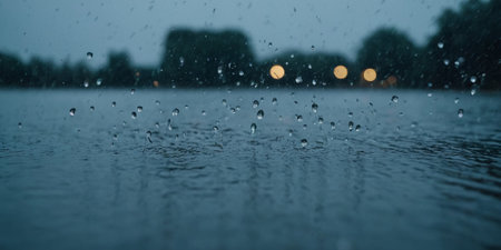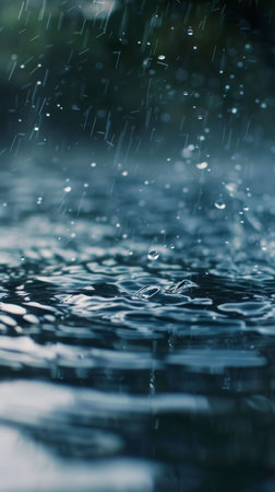 Heavy rain cascading down and creating ripples and droplets on the waters surface, set against a blurred green background on a warm summer day, evokes a sense of freshness