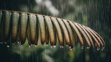 Detailed macro shot of a wilting brown and green leaf during a downpour. Water droplets hang from the frond against a blurred, lush green background creating a moody scene.