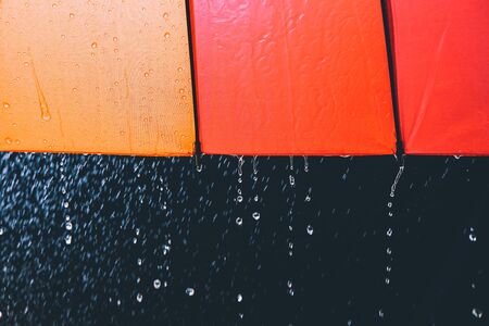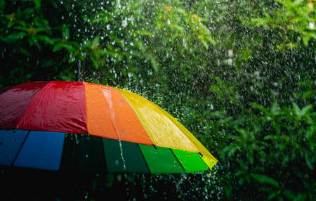 Rain drops falling on rainbow umbrella in the day with nature background