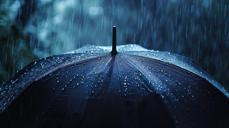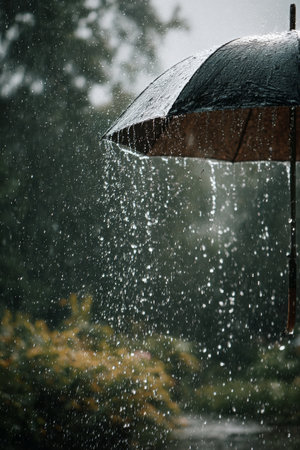 Raindrops cascade from a black umbrella as heavy rain falls in a lush garden, capturing the tranquil yet dynamic atmosphere of a rainy autumn day.