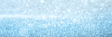 Blurred defocused bokeh banner with Christmas lights and silver glitter sparkles. Blue abstract banner with light leak