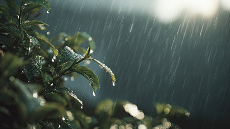 A close-up showcases green leaves amidst falling raindrops. The image highlights the textures of the leaves, contrasting against the dark background. The composition suggests an outdoor environment with soft lighting and a natural aesthetic. Suitable for various editorial and commercial uses related to nature.