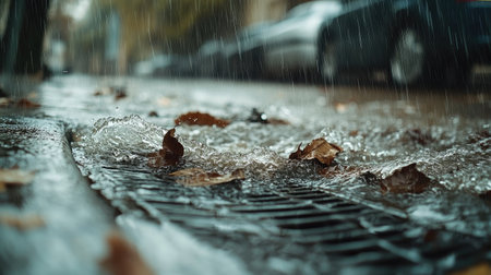 Close-up view of heavy rain flooding a street drain, leaves and dirt swirling in the turbulent water