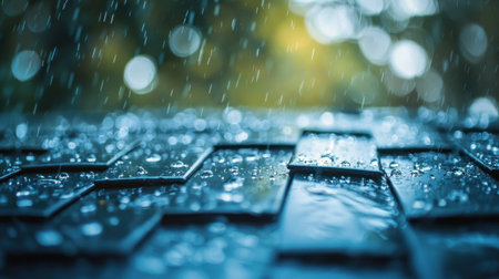 Rain droplets on a dark tiled surface with a blurred green background, capturing the essence of tranquility and nature s beauty during a rainy season