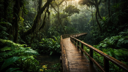 Tropical rainforest, tranquil scene, mysterious, lush green forest.