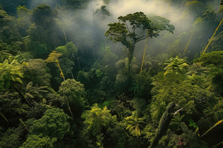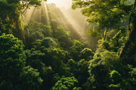 An overhead shot reveals a dense forest canopy, filled with vibrant green foliage. The scene is illuminated by sunlight filtering through the trees, creating a hazy effect with fog. The composition and lighting may be suitable for illustrating natural environments, ecosystem studies, or general commercial use.