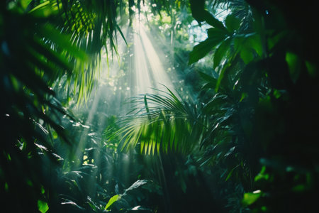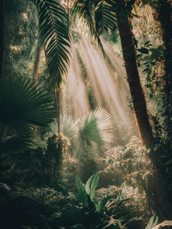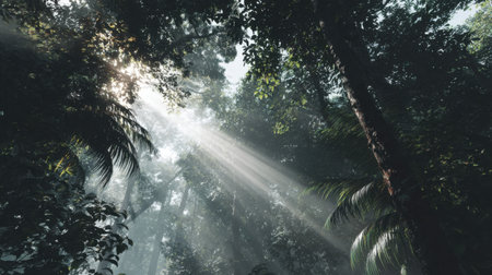 Sun rays pierce through the dense green canopy of a tropical rainforest, illuminating the misty air with dramatic light beams. A serene and natural forest scene.