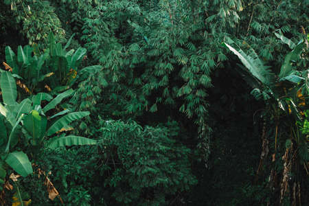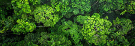 Vibrant green foliage covers dense rainforest from above showing intricate tree tops and layered leaves in natural habitat