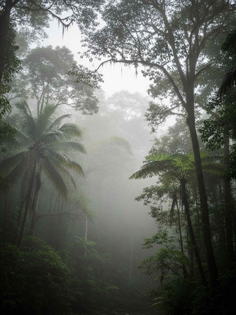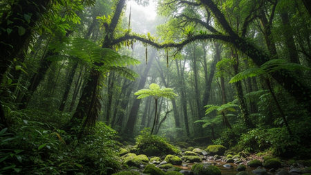 A captivating view of a misty jungle landscape showcasing lush greenery and tall trees. This serene environment evokes a sense of tranquility and wilderness.