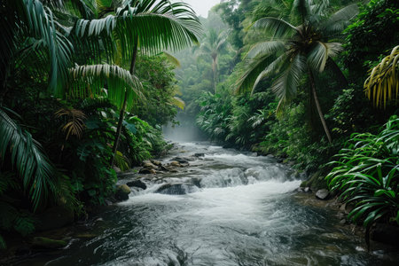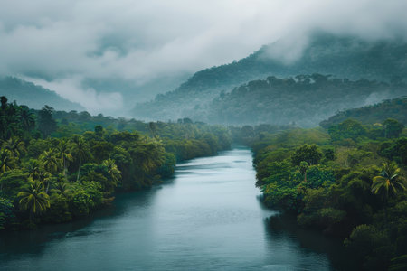 A tranquil river flows gently through a dense jungle, surrounded by mist-covered hills. Palm trees line the banks, creating a serene atmosphere in the early morning light.