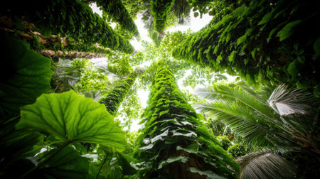 A low-angle view looking up through a dense, vibrant green rainforest canopy with sunlight filtering through the...