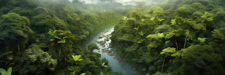 Tropical rainforest with river flowing through lush green forest with AI-Generated Images
