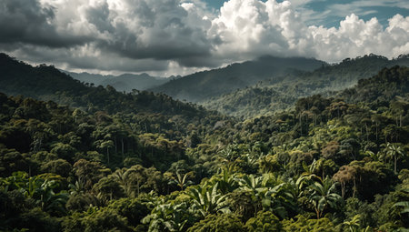 An expansive view of a tropical valley unfolds, featuring rolling green forested hills stretching towards the horizon. The scene is under a cloudy, overcast sky, with hints of mist and fog softening the distant peaks. conveys a sense of vastness and the serene, untouched beauty of a lush jungle environment.